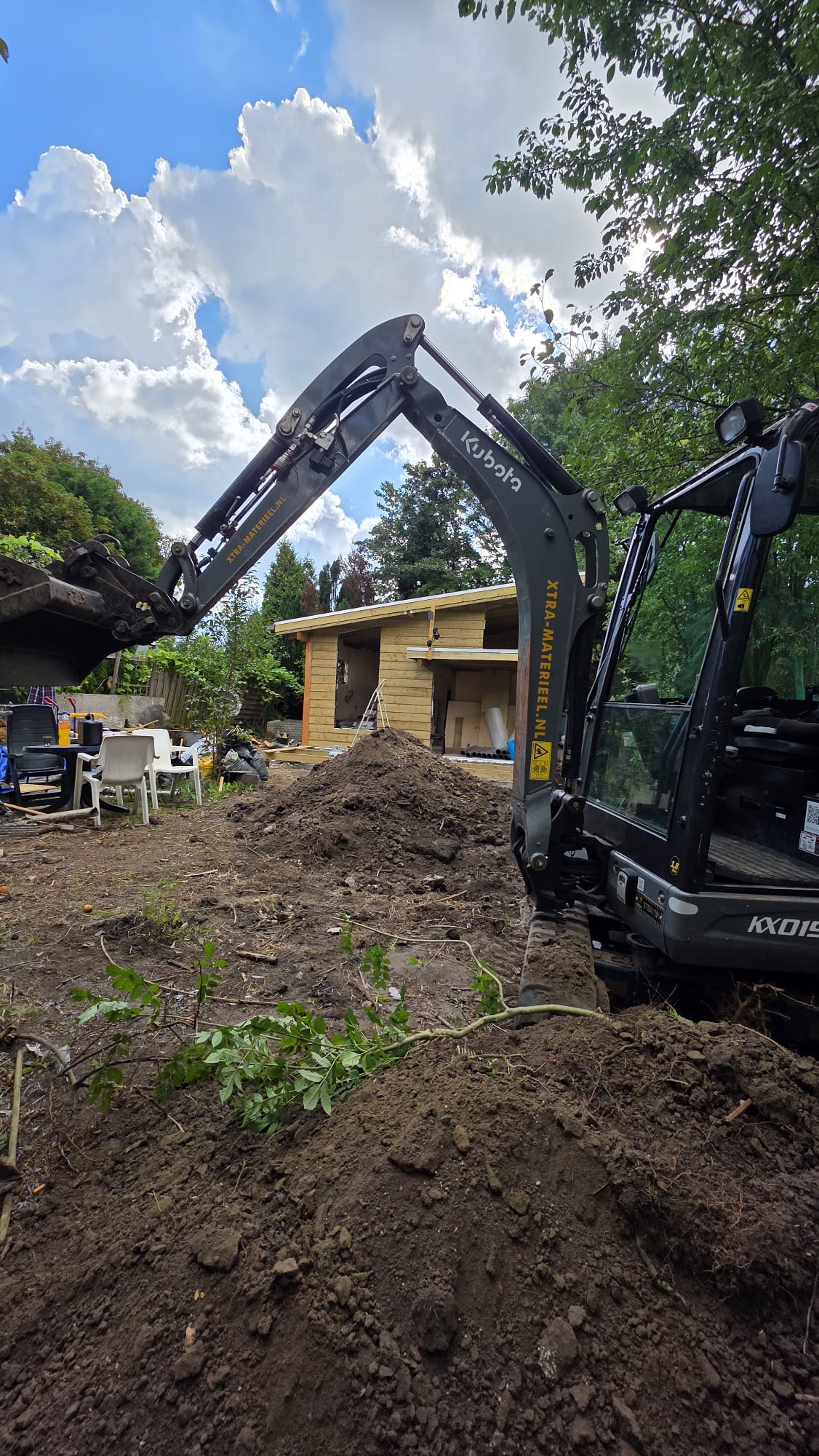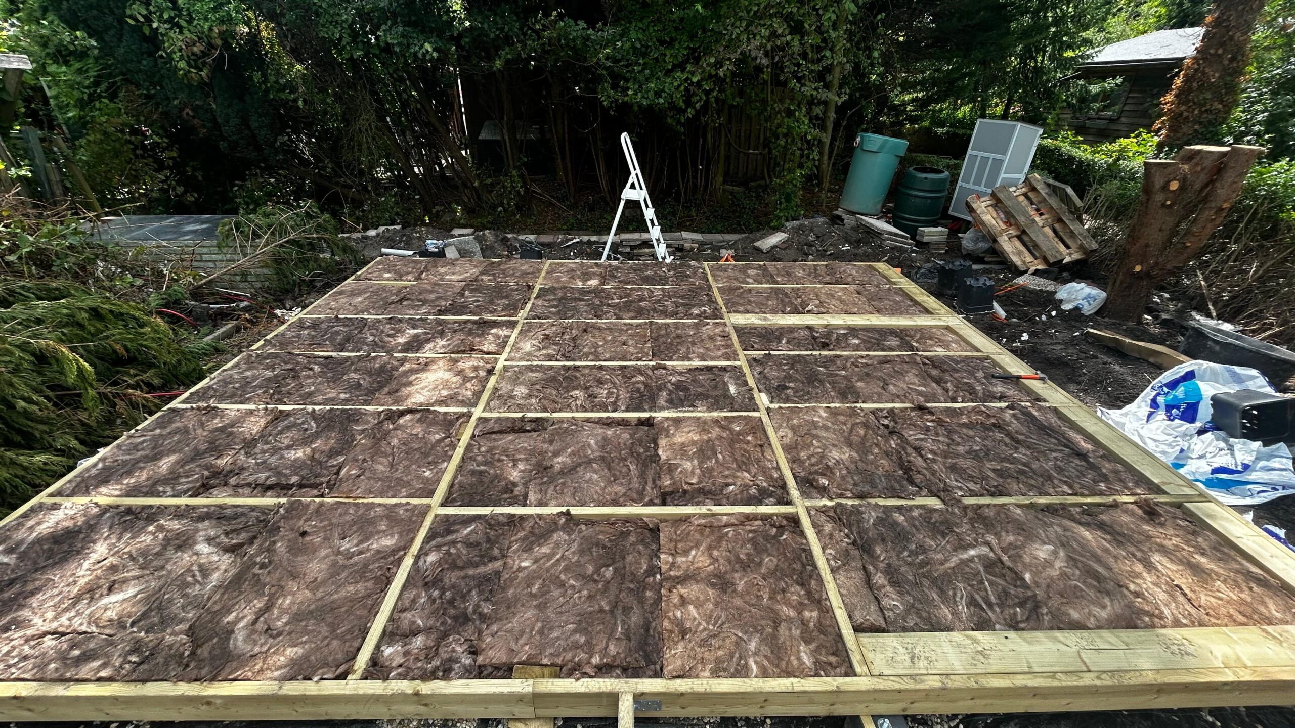 Het tuinhuis staat stevig op 16 betonpoeren, met voldoende gestort beton om verzakking te voorkomen. Rondom het huis is een drainagebuis aangelegd voor optimale waterafvoer, met grind bovenop om de afvoer te verbeteren en de stabiliteit van het tuinhuis te garanderen.